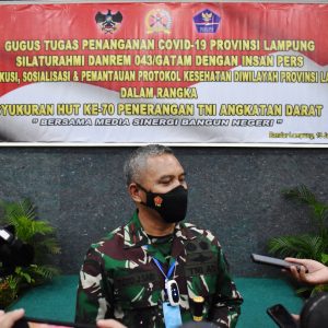Bandar Lampung, Komandan Korem 043/Garuda Hitam Brigjen TNI Toto Jumariono.S.S,.M.I.Kom, rabu (13/01/2021) bersama Kasrem, para Kasi Korem 043/Gatam, bersilaturahmi dengan Insan Pers Guna Diskusi, Sosialisasi, dan Pemantauan Protokol Kesehatan di Wilayah Provinsi Lampung, Dalam rangka Syukuran HUT Ke-70 Penerangan TNI Angkatan Darat “ Bersama Media Sinergi Bangun Negeri ” bertempat di Aula A. Yani Makorem 043/Gatam.