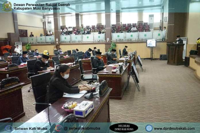Musi Banyuasin,- Dewan Perwakilan Rakyat Daerah Kabupaten Muba menggelar Rapat Paripurna Masa Persidangan III Rapat ke-14 tentang Penyampaian Rancangan Kebijakan Umum Anggaran (KUA) dan Prioritas & Plafon Anggaran Sementara (PPAS) RAPBD Kabupaten Muba Tahun Anggaran 2022 di ruang Rapat Paripurna DPRD Kabupaten Muba pada hari Selasa (27/07/2021).