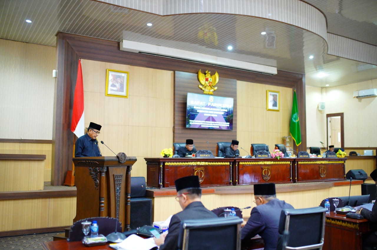 SEKAYU – Pj Bupati Musi Banyuasin (Muba) H Apriyadi melalui Pj Sekretaris Daerah Kabupaten Muba Musni Wijaya SSos MSi. Menghadiri Rapat Paripurna Masa Persidangan I Rapat Ke-33, Dalam Rangka Penyampaian Hasil Reses I DPRD Kabupaten Muba Tahun 2022, di Ruang Rapat Paripurna DPRD Kabupaten Muba, Senin (5/12/2022).Rapat dipimpin oleh Wakil Ketua DPRD Muba Jhon Kanedy dan dihadiri para Anggota DPRD Muba, Forum Koordinasi Pimpinan Daerah, Para Asisten serta Kepala Perangkat Daerah Muba.