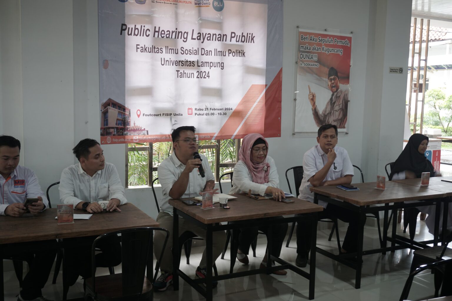 BANDAR LAMPUNG-Fakultas Ilmu Sosial dan Ilmu Politik (FISIP) Universitas Lampung (Unila) adakan Public Hearing layanan publik sebagai sarana mendengarkan aspirasi dan keluh kesah mahasiswa di lingkup fakultas. Kegiatan berlangsung pada Rabu, 21 Februari 2023, di Gedung H, Food Court FISIP Unila.