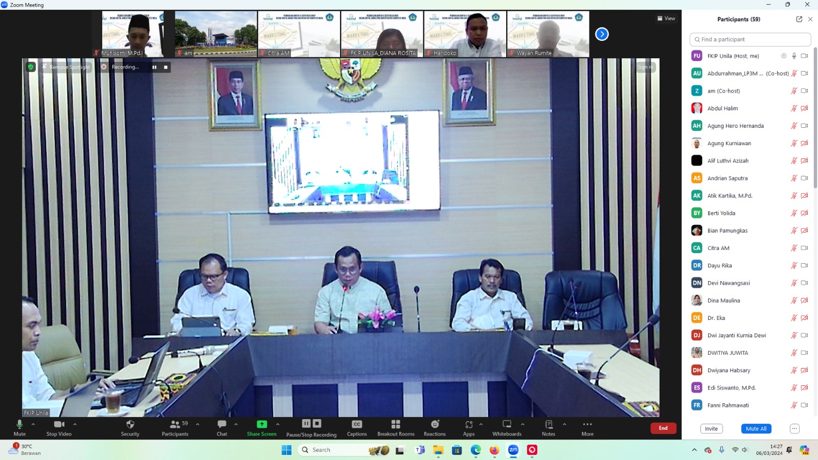 BANDARLAMPUNG – Fakultas Keguruan dan Ilmu Pendidikan (FKIP) Universitas Lampung (Unila) menggelar Pelatihan Sertifikasi Kompetensi bagi Dosen pada tanggal 06-09 Maret 2024, melalui zoom meeting. Acara ini dihadiri oleh Ketua LP3M Prof. Dr. Abdurrahman, M.Si., serta Dekan FKIP Unila, Prof. Dr. Sunyono, M.Si., yang didampingi oleh para wakil dekan, Koordinator Tata Usaha, para Sub Koordinator, dan 60 dosen di lingkungan FKIP Unila. Hadir juga perwakilan dari PT Kharisma Lumbung Ilmu (Kalungi).