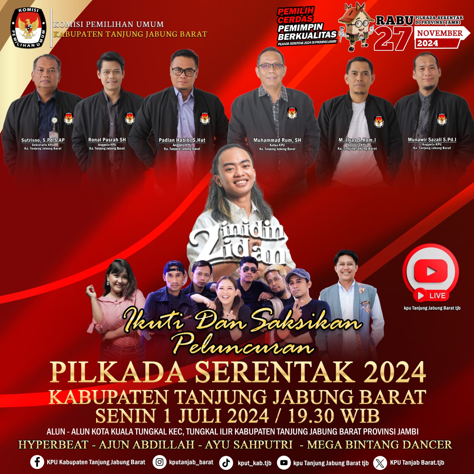 KUALATUNGKAL, Sidakpost – Komisi Pemilihan Umum (KPU) Kabupaten Tanjung Jabung Barat (Tanjab Barat) menggelar pesta peluncuran Pemilihan Kepala Daerah (Pilkada) yang digelar Serentak 2024 Kabupaten Tanjab Barat pada hari Senin 24 Juli 2024 pukul 19.30 WIB.