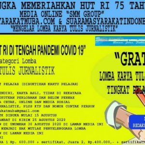 Musi Banyuasin,– Lomba Karya Tulis Jurnalistik SMM Group (suaramasyarakatmuba.com & suaranya ralat Indonesia.com) resmi hari ini 15 Agustus di mulai untuk pelajar dan peserta yang ingin mengirimkan karya tulis sudah bisa ke email suaramasyarakatmuba@gmail.com demikian disampaikan langsung Pimpinan Umum Suaramasyarakatindonesia.com Iwan