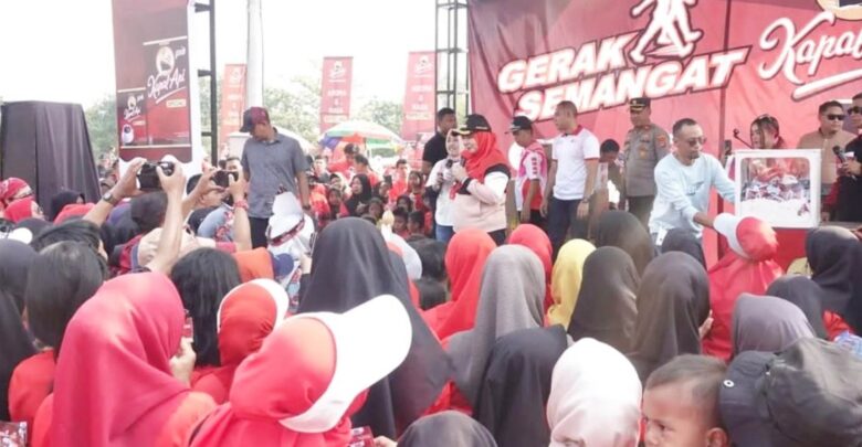 Wali Kota Bandar Lampung, Eva Dwiana, turut serta dalam kegiatan jalan sehat Gerak Semangat Kopi Kapal Api, di Kecamatan Telukbetung Timur, Minggu, 8 Oktober 2023.