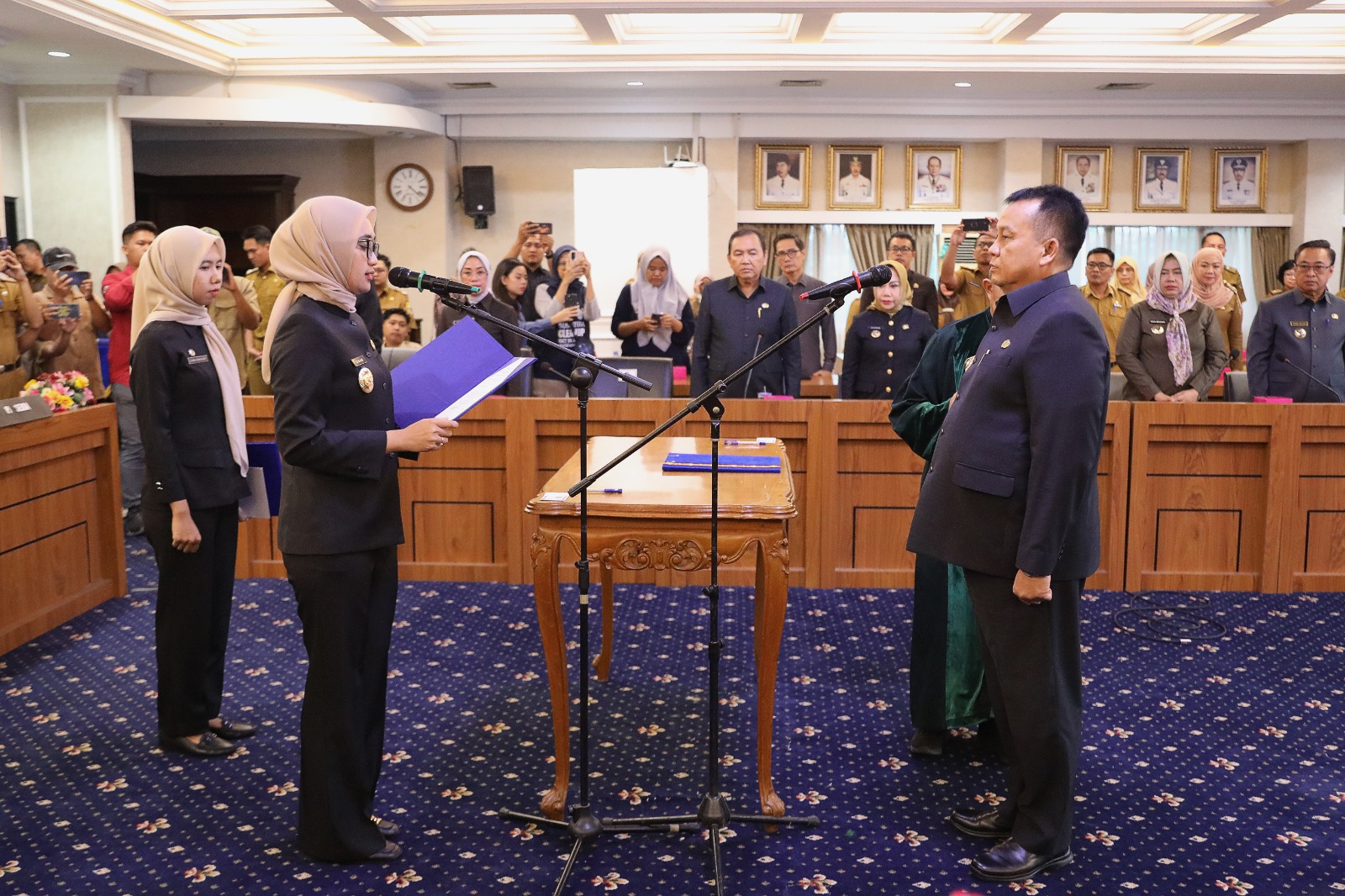 Pelantikan dan pengambilan sumpah Lukman Pura dilakukan Wakil Gubernur Lampung Jihan Nurlela, di Ruang Rapat Utama, Kantor Gubernur Lampung, Bandarlampung, Senin (26/5/2025).