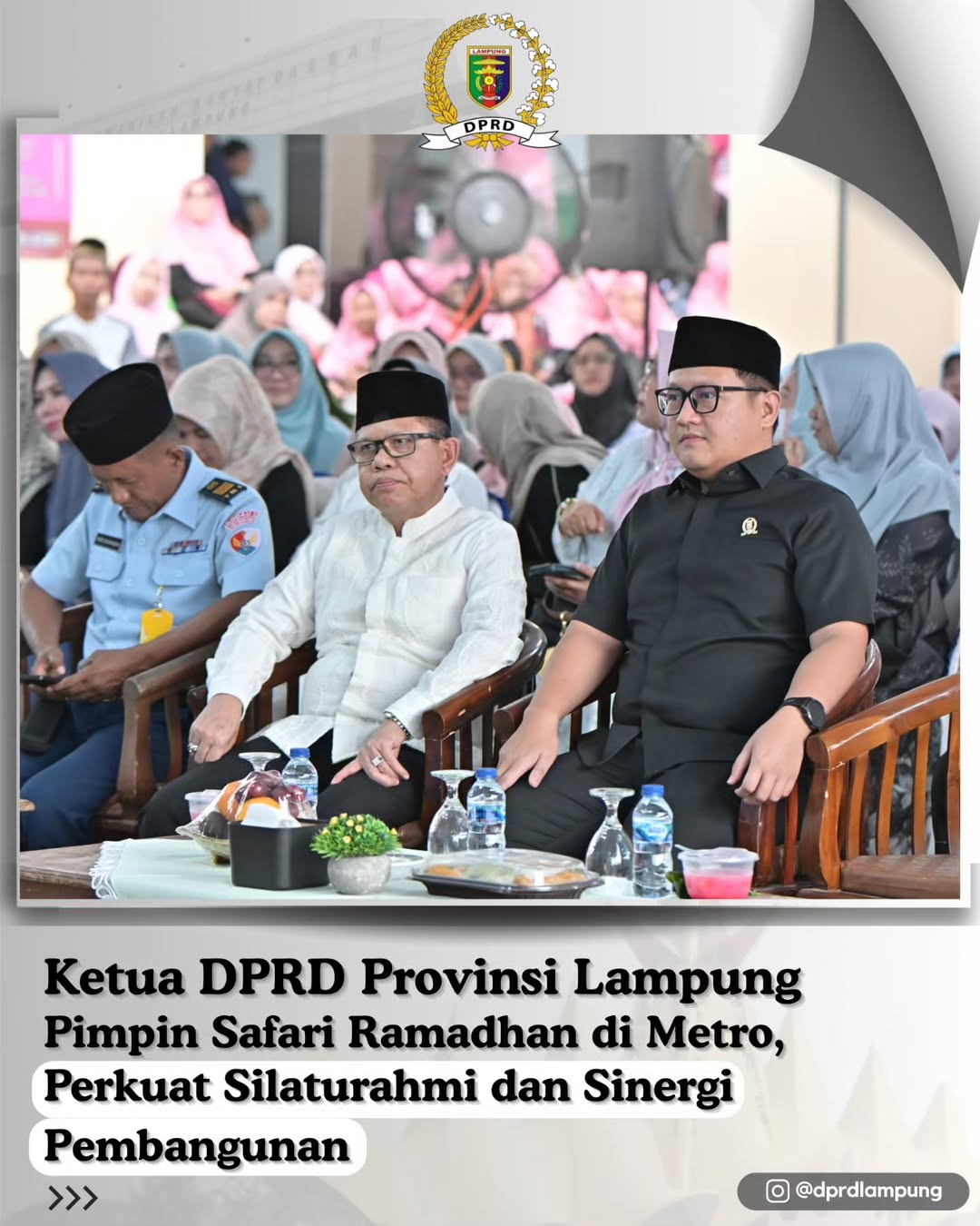 Metro — Ketua DPRD Provinsi Lampung A. Giri Akbar, S.E., M.B.A. memimpin langsung kegiatan Safari Ramadhan 1447 Hijriah Pemerintah Provinsi Lampung yang dilaksanakan di Masjid Nurus Sholihin, Metro Pusat, Kota Metro, Rabu (25/2/2026).