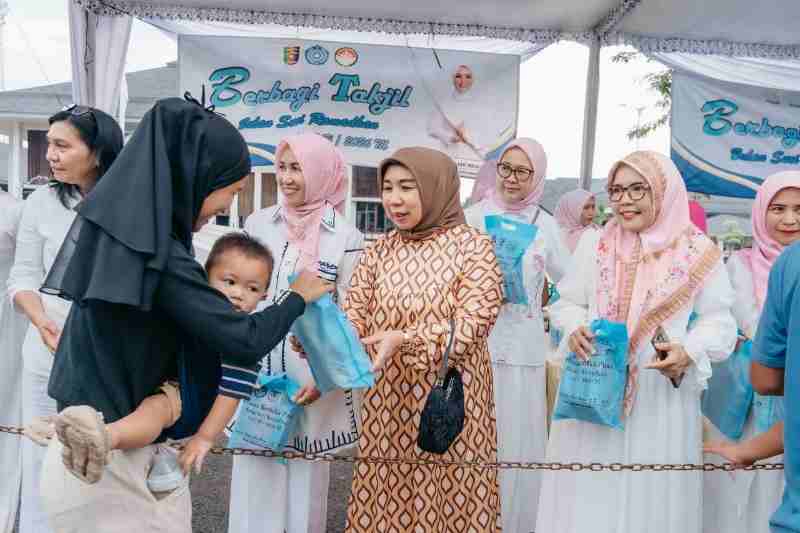 Seperti hari-hari sebelumnya, pembagian takjil dilakukan menjelang waktu berbuka kepada pengendara dan warga yang melintas di kawasan tersebut. Ibu-ibu Dharma Wanita tampak membagikan paket takjil secara langsung dengan tertib, disambut antusias oleh masyarakat.