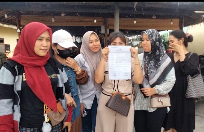Belasan korban penipuan sembari menunjukkan Surat Laporan Polisi Mereka di Polres Serdang Bedagai dengan Nomor Laporan LP/B/238/VII/2025/SPKT/POLRES SERGAI/POLDA SUMUT/ Yang Melaporkan Kasus penipuan dengan modus Operasi Arisan atau Investasi Bodong dengan terlapornya RNS yang saat ini sudah melarikan diri bersama suami dan anaknya.hal tersebut dikatakan Tia kepada media kamis 7 Agustus 2025.