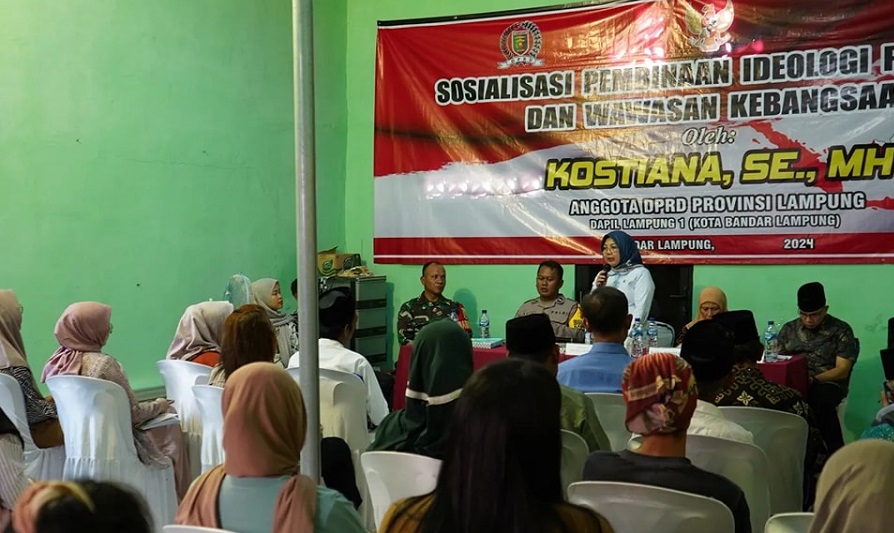 Ketua Fraksi PDI Perjuangan DPRD Provinsi Lampung, Kostiana, SE. MH gelar Sosialisasi Pembinaan Ideologi Pancasila dan Wawasan Kebangsaan (IPWK) di jalan Selat Gaspar 2 RT. 01 Kelurahan Panjang Utara Kota Bandar Lampung, Senin (8/7/2024).