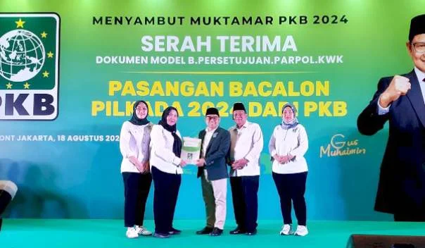 Surat rekomendasi atau Dokumen Model B Persetujuan Parpol KWK PKB diserahkan oleh Ketua Umum PKB Muhaimin Iskandar (Cak Imin) kepada Eva Dwiana- Deddy Amarullah, di Hotel Fairmont Jalan Asia No 8 Gelora, Kecamatan Tanah Abang, DKI Jakarta, Minggu, 18 Agustus 2024.