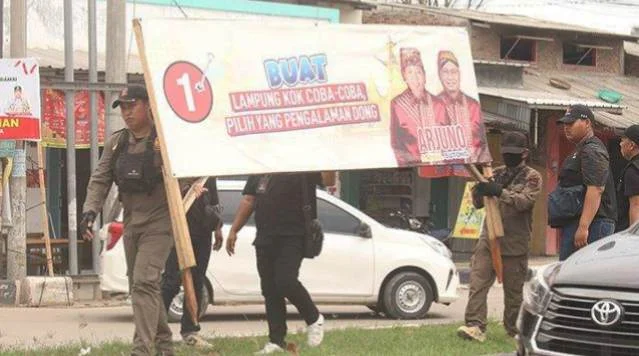 Masuki masa tenang kampanye Pilkada 2024, Satuan Polisi Pamong Praja Kota Bandar Lampung, mulai membersihkan alat peraga kampanye (APK) yang masih terpasang di sejumlah lokasi.