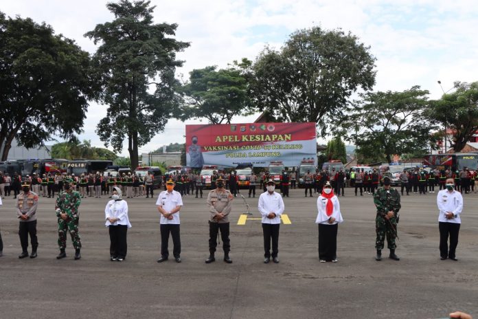 Bandar Lampung — Polda Lampung bersama Pemerintah Provinsi Lampung dan stakeholder terkait melaksanakan Apel Kesiapan Vaksinasi Covid-19 Keliling, bertempat di Lapangan Saburai-Enggal Bandar Lampung, Senin (21/7).