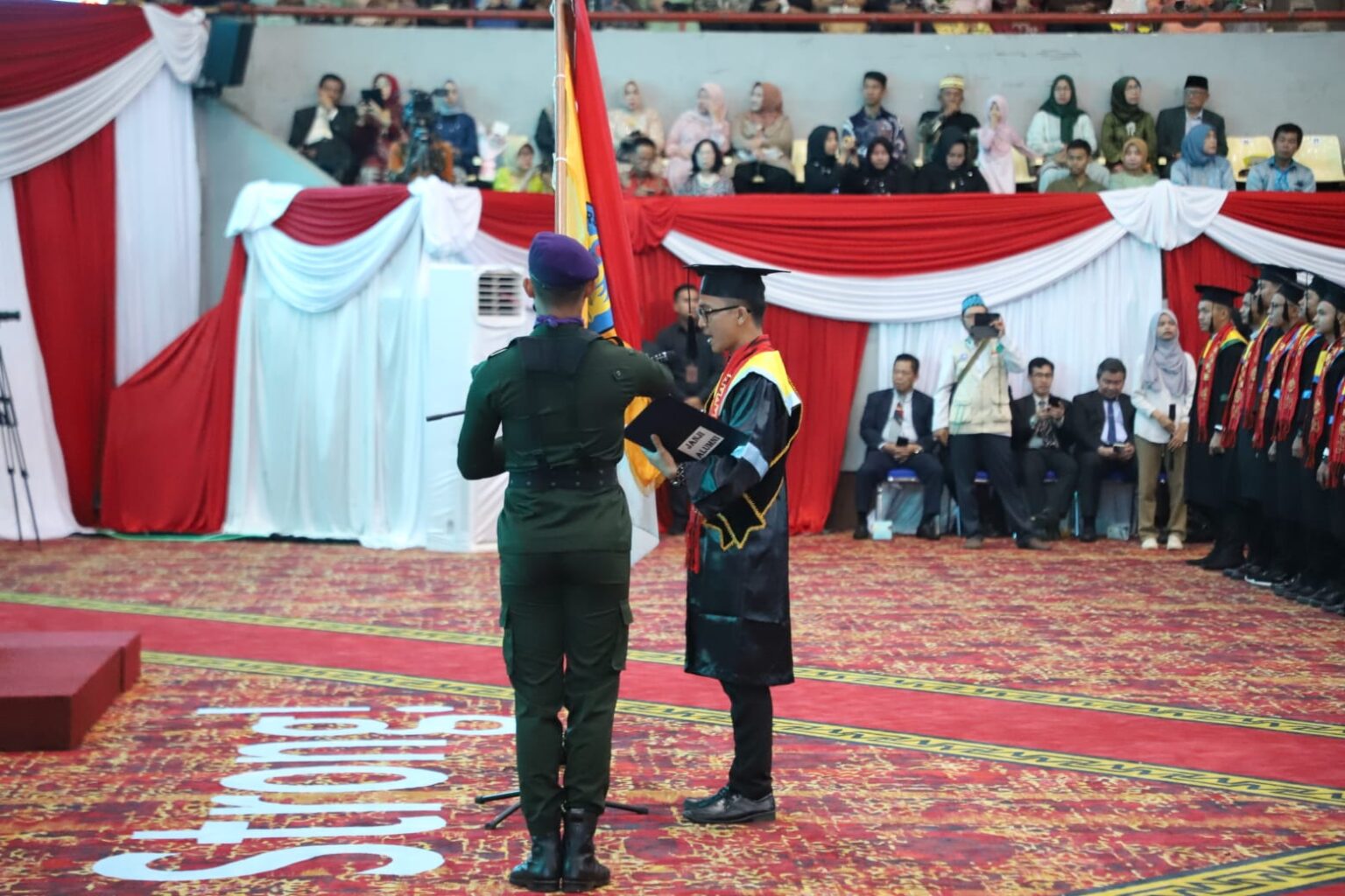 Wakil Rektor Bidang Akademik Unila Dr. Eng Suripto Dwi Yuwono, M.T., menyampaikan laporan terkait wisuda periode tiga. Marindo Kurniawan meraih predikat lulusan terbaik program doktor S-3 ilmu ekonomi dengan total skor 374.