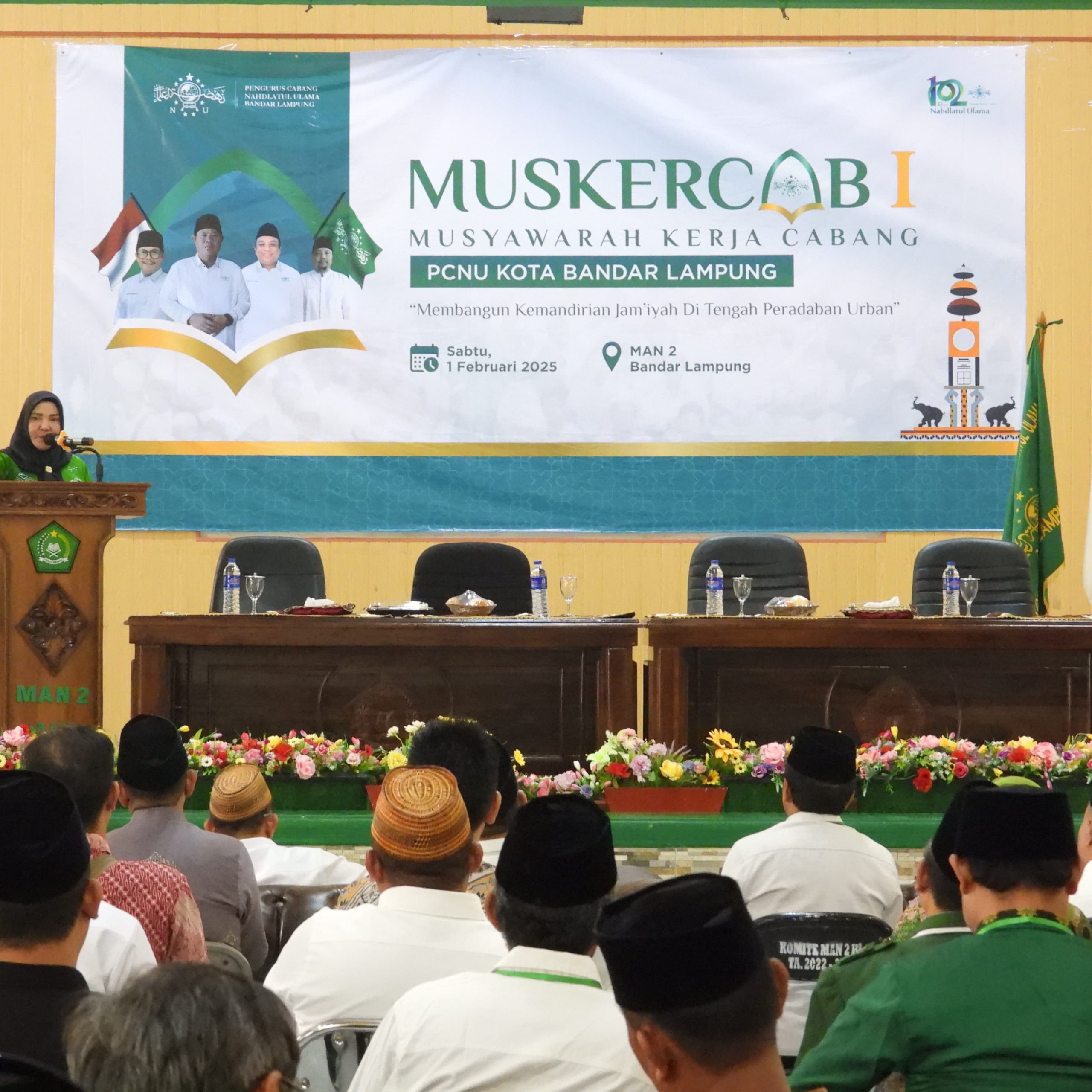 Walikota Bandar Lampung Hj. Eva Dwiana membuka secara resmi muskercab I PCNU kota Bandar Lampung,di lokasi Aula Man 2 Sabtu (01/02/2025).